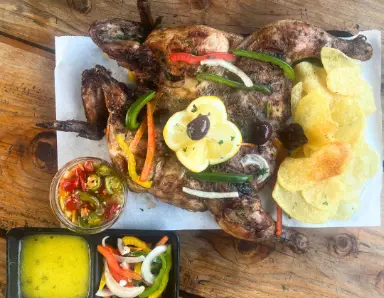 Tender full chicken, Mozambique style, served with pickles & lemon